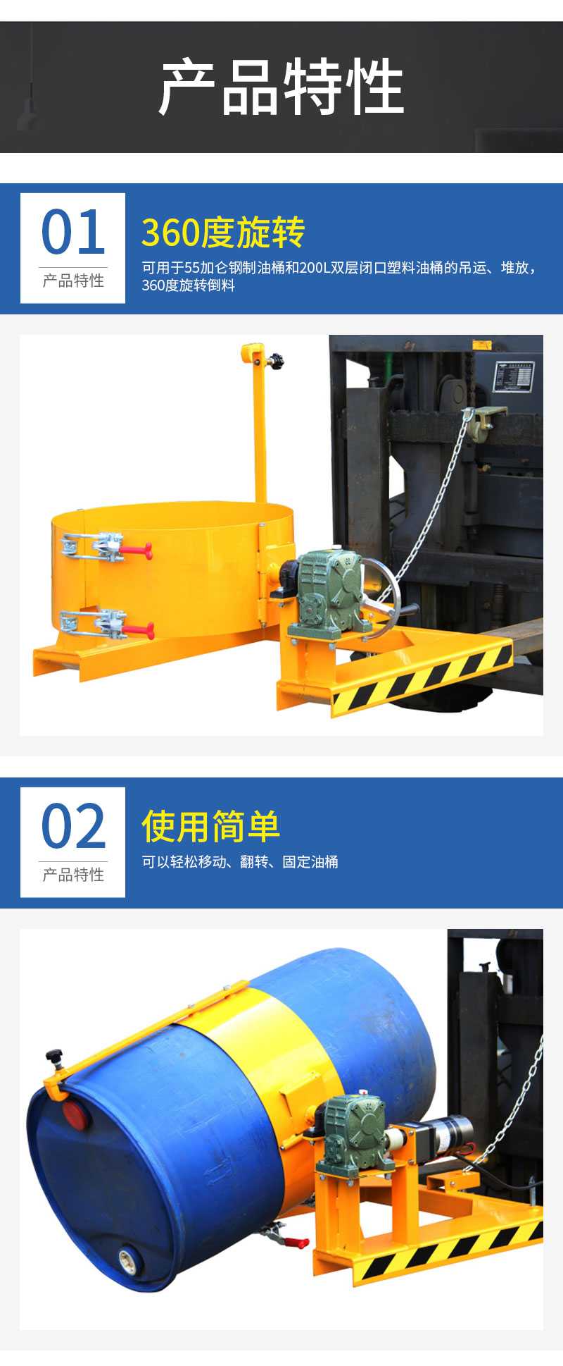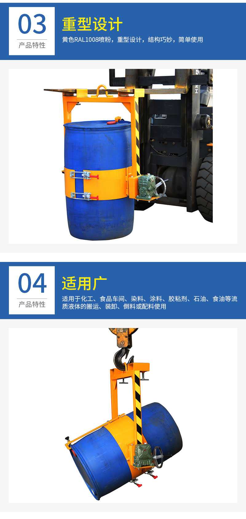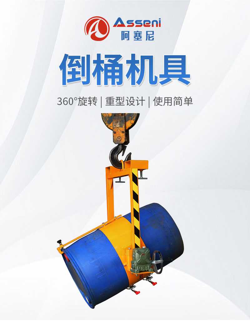 ★可用于55加侖鋼制油桶翻轉(zhuǎn)車和200L雙層閉口塑料油桶的吊運(yùn)、堆放,手搖360度旋轉(zhuǎn)倒料。